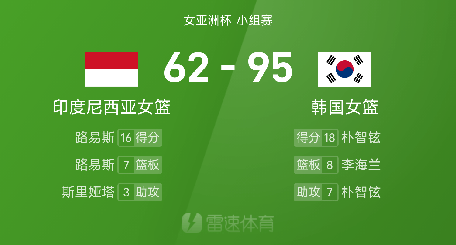 双方全场战罢,韩国女篮95-62战胜印度尼西亚女篮。
