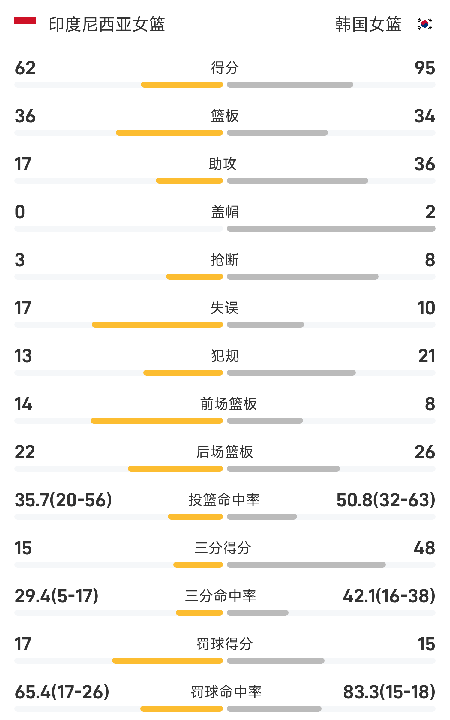 双方全场战罢,韩国女篮95-62战胜印度尼西亚女篮。