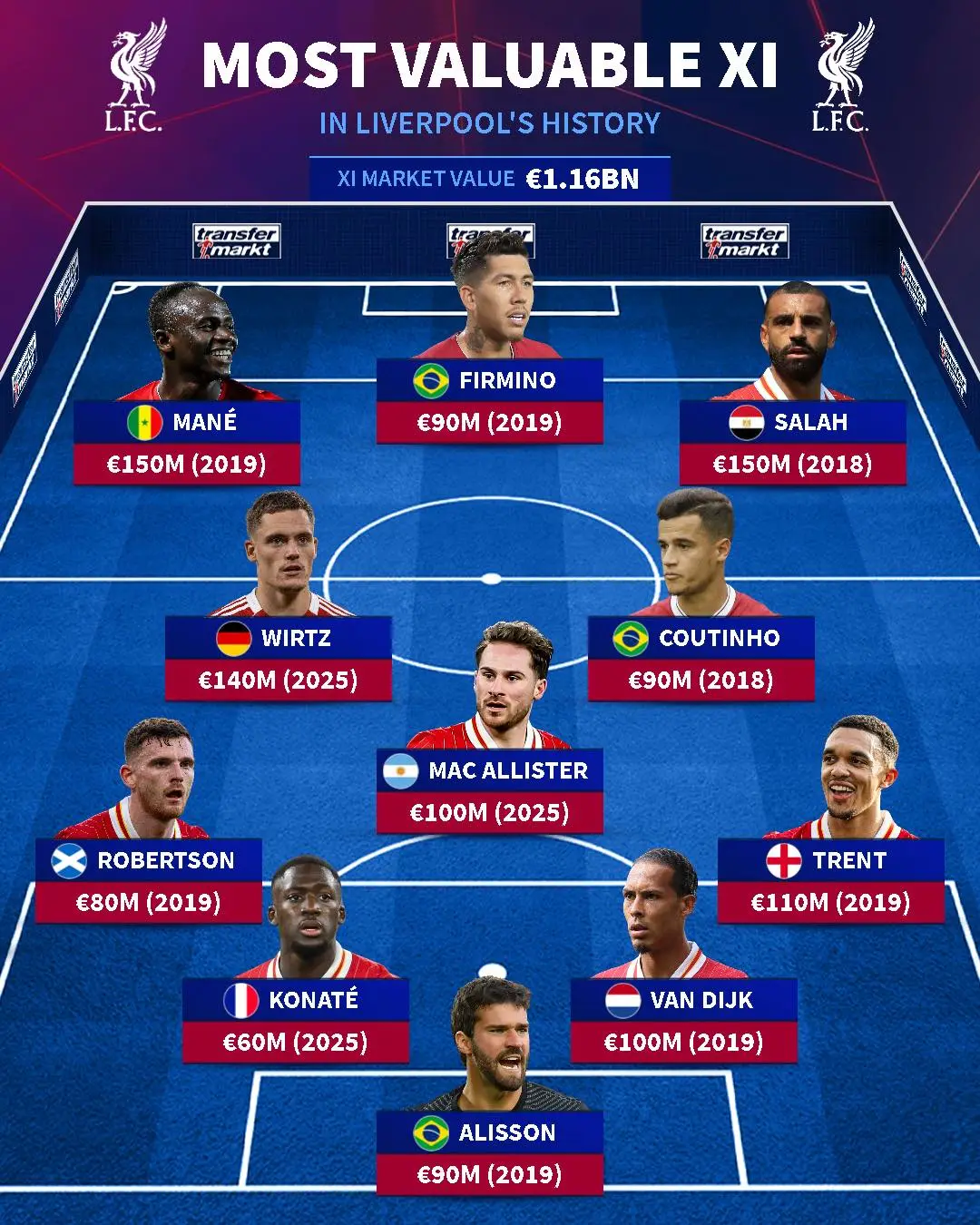 罗伯逊(2019年,8000万欧)、科纳特(2025年,6000万欧)、范戴克(2019年,1亿欧)、阿诺德(2019年,1.1亿欧)
